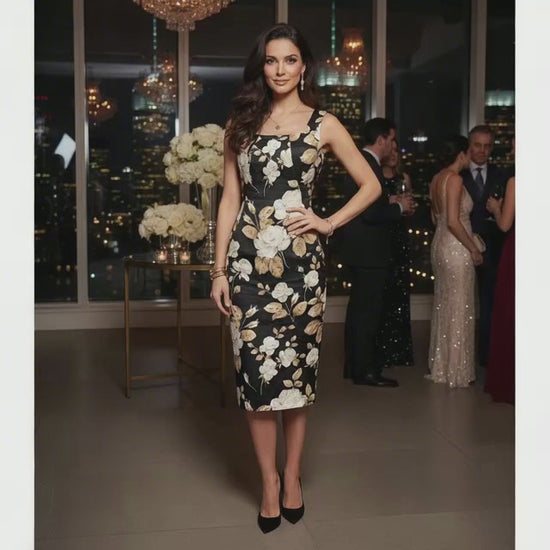Elegant and bold, this sleeveless brocade midi dress blends timeless floral romance with couture-inspired detail. The rich black background is adorned with beige roses and golden leaves, woven into textured brocade that sculpts the silhouette with subtle structure. Inside, a pure silk leopard-print lining adds a daring hidden accent, while a back slit ensures ease of movement and graceful flow.
