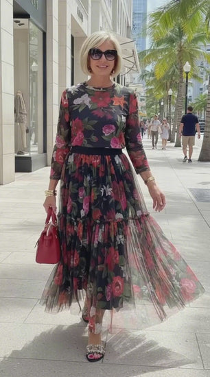 Romantic, weightless, and undeniably elegant — this black floral mesh set brings couture-inspired sophistication to everyday moments and special occasions alike. Crafted from soft semi-sheer elastic mesh, the set features a fitted long-sleeve top and a lined tiered skirt that moves beautifully with every step.