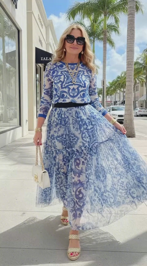 Effortless, lightweight, and travel-ready — this blue majolica porcelain print set combines Mediterranean artistry with modern practicality. Made from soft elastic mesh fabric, the design features a see-through long-sleeve top and a lined pleated skirt that moves gracefully while keeping you comfortable in any climate.