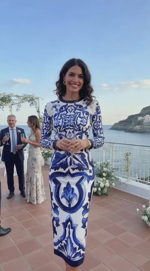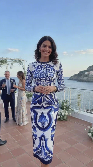 Refined and striking, this long sleeve pure silk dress transforms the artistry of Italian majolica porcelain into timeless Mediterranean elegance. The bold cobalt and white motif is crafted on lustrous silk, with a tailored midi silhouette that flatters while offering effortless comfort. Fully lined in white silk, the design delivers both luxury and ease, moving gracefully with every step.