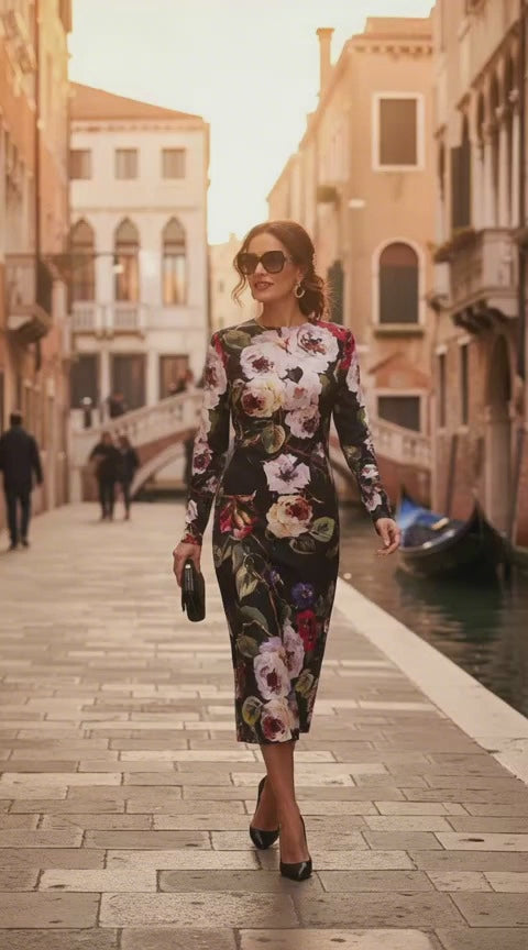 With a tailored midi silhouette, round neckline, and long sleeves, the cut flatters while ensuring all-day comfort. Perfect for Mediterranean weddings, autumn soirées, and elegant evening dinners, this piece embodies timeless Italian glamour with an unexpected edge.