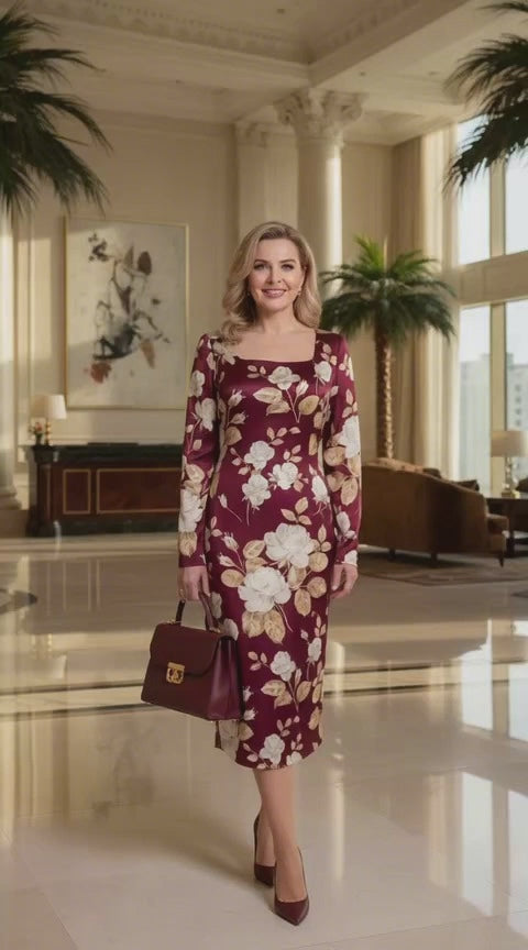A tailored midi silhouette with a square neckline and a back slit enhances movement while flattering the figure. Perfect for Mediterranean weddings, autumn soirées, and elegant dinners, this dress embodies timeless glamour with a modern twist.
