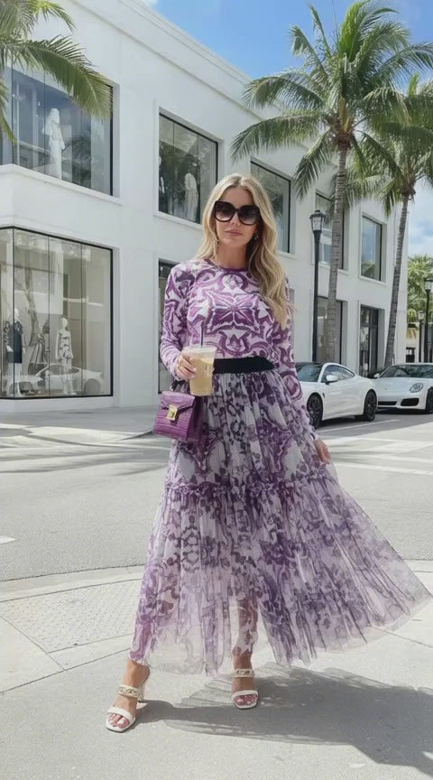 Vivid, feminine, and irresistibly Mediterranean — this purple majolica porcelain print set captures the essence of Italian summer in a lightweight, travel-friendly design. Made from soft elastic mesh fabric, it includes a semi-sheer long-sleeve top and a lined pleated skirt that combines comfort with couture-inspired charm.