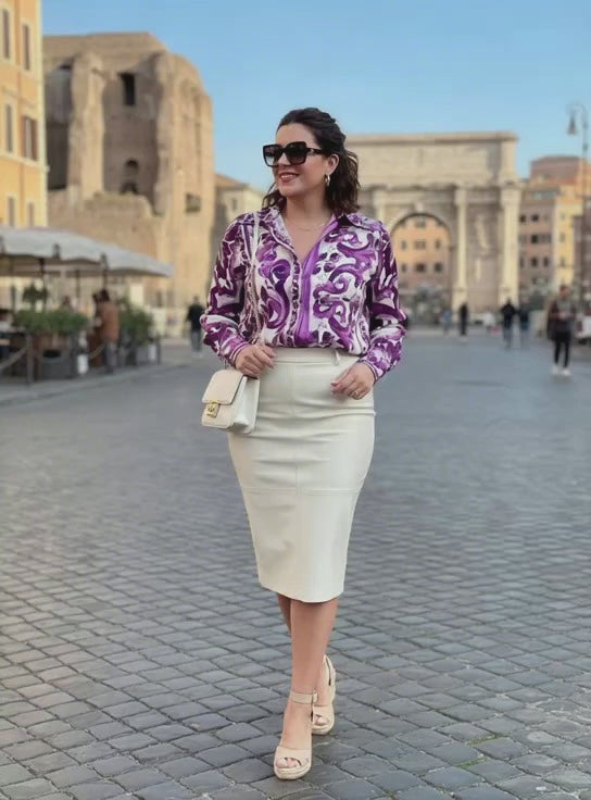 Channel Mediterranean elegance with this silk blouse in purple majolica print, inspired by the ornate ceramic tiles of Southern Italy. The long-sleeve design features a classic collar and button-front closure, making it a versatile piece that transitions from day to evening with ease.
